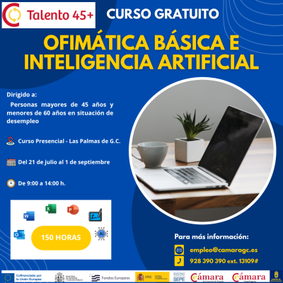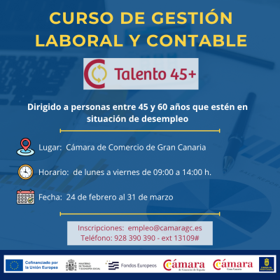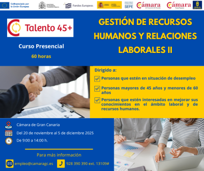 Si tienes entre 45 a 60 años (inclusive) y buscas empleo, desde tu Cámara de Comercio te acompañamos en el proceso. Analizaremos tus necesidades e intereses para participar en el Talento 45+ mediante un itinerario formativo para mejorar tus competencias digitales/profesionales, con el objetivo de favorecer tus posibilidades de inserción laboral.