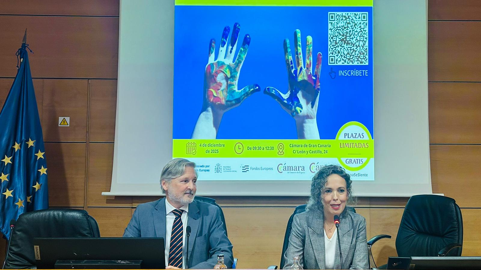 La Cámara de Comercio de Gran Canaria acogió en la mañana de hoy la celebración de la I Jornada FP Dual Inclusiva: Talento sin Barreras, un encuentro creado en el marco del Programa FP PYME, cofinanciado por el Fondo Social Europeo y Cámara de España, con el objetivo de reflexionar sobre cómo avanzar hacia una Formación Profesional verdaderamente inclusiva, capaz de abrir oportunidades reales de empleo para todas las personas. Más de un centenar de personas vinculadas al ecosistema formativo y empresarial participaron en la jornada. Entre ellas se encontraban representantes de compañías colaboradoras, alumnado y profesionales con discapacidad, prospectores laborales y profesorado de FP con experiencia en atención a la diversidad.