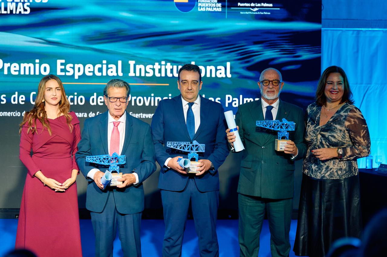 En esta edición, la Cámara de Comercio de Gran Canaria, representada por su vicepresidente Juan Acosta, junto con la Cámara de Lanzarote y la Cámara de Fuerteventura, recibió el Premio Especial Institucional. Este reconocimiento pone en valor la labor de las Cámaras en la dinamización económica y en la cooperación público-privada, fundamentales para el desarrollo del tejido empresarial vinculado al sector portuario.