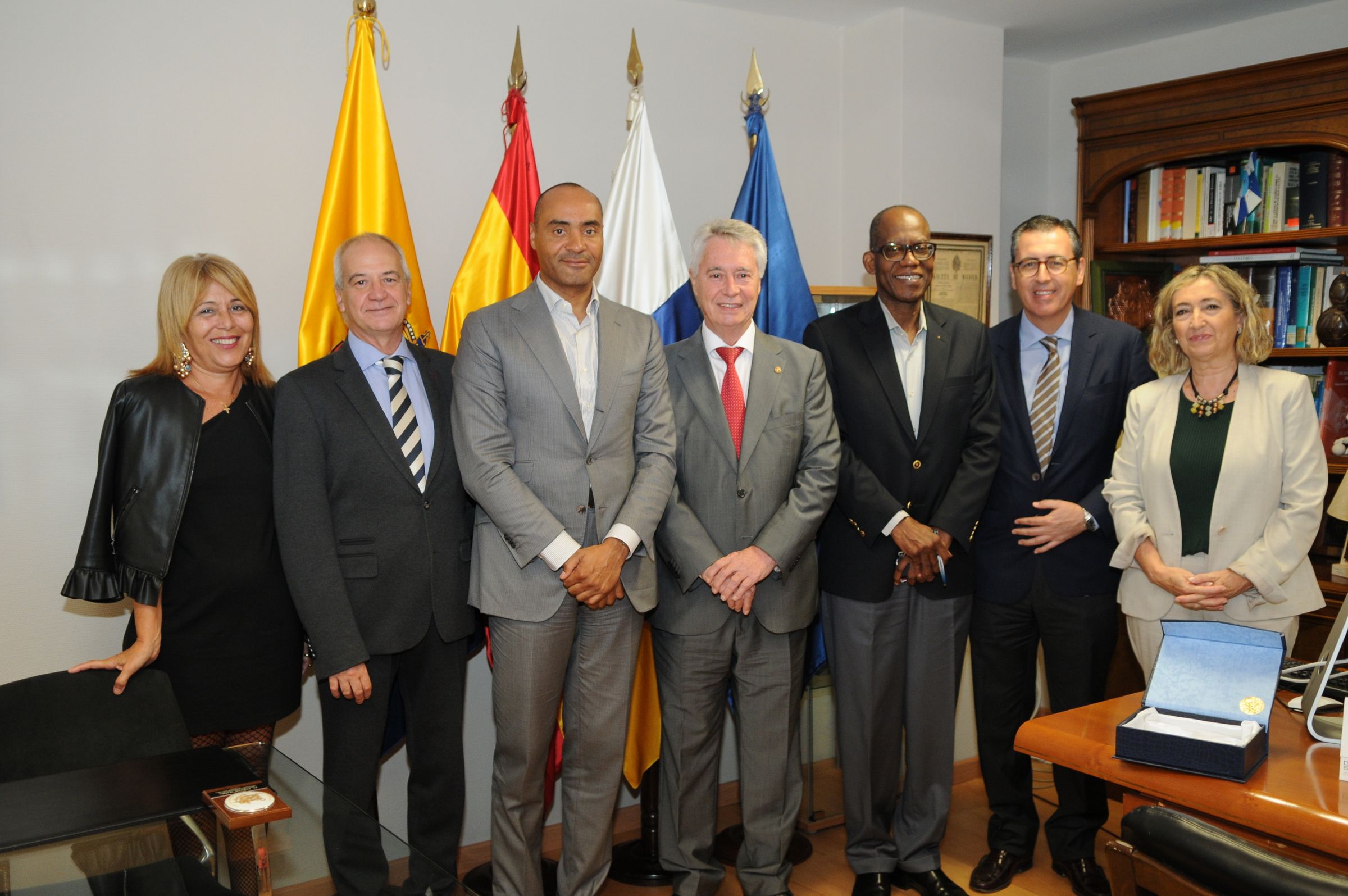 El Ministro de Turismo de la República Democrática del Congo, Franck Malila, acompañado por su jefe de Gabinete, Faustino Mpako, visitaron hoy la Cámara de Comercio de Gran Canaria y fueron recibidos por el presidente de la Cámara de Comercio de Gran Canaria, José Sánchez Tinoco, acompañado por el presidente de la comisión de Turismo, Santiago de Armas, junto a representantes empresariales que forman parte de la Comisión Carlos Gimeno y Marta González, así como, por la directora General Pilar Alcaide.
