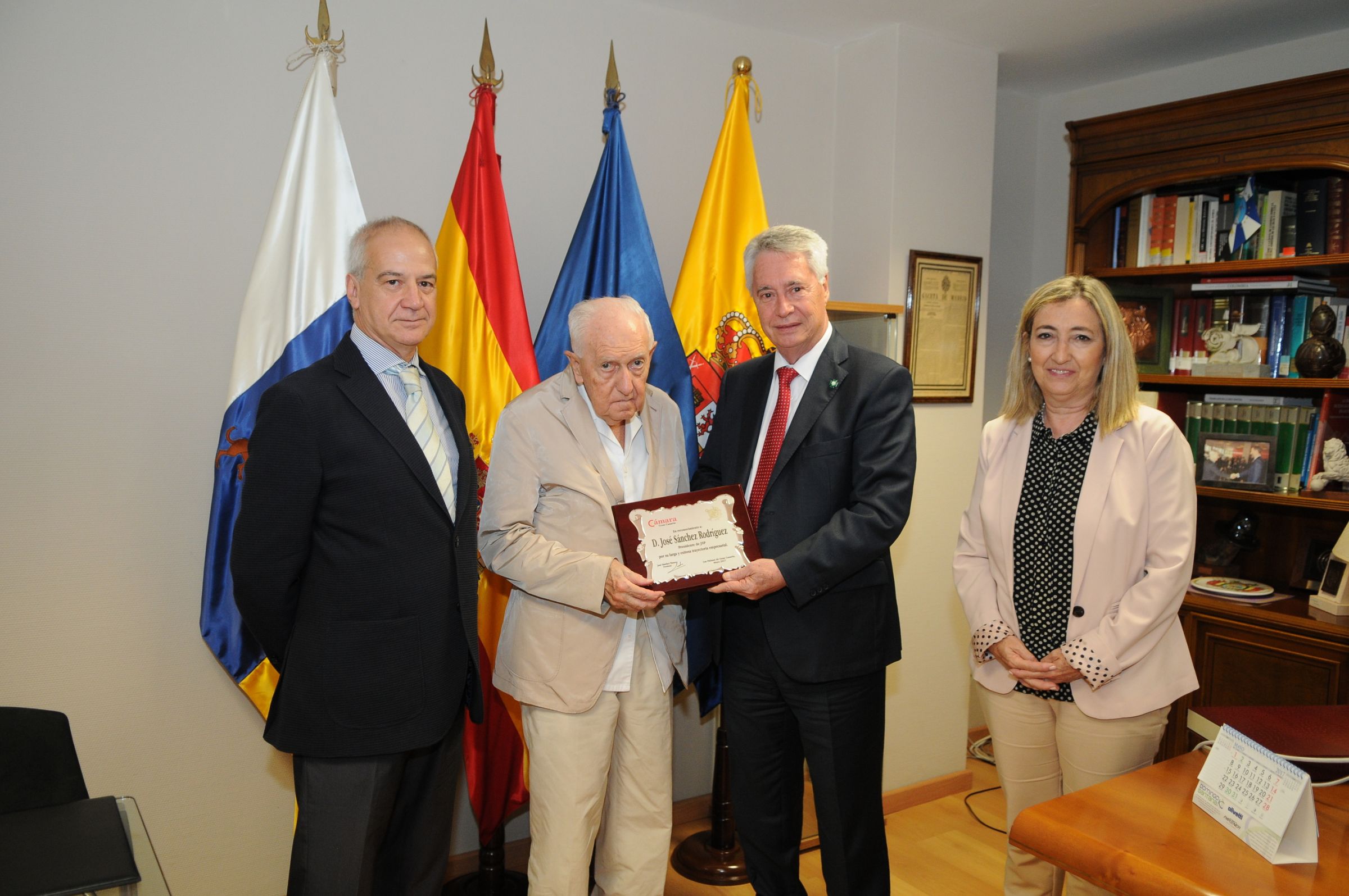 Hoy el presidente de la Cámara de Comercio de Gran Canaria, José Sánchez Tinoco acompañado por el vicepresidente Santiago de Armas, y la directora general, Pilar Alcaide, ha querido reconocer la importante labor realizada por el empresario José Sánchez Rodríguez al frente de la empresa JSP.