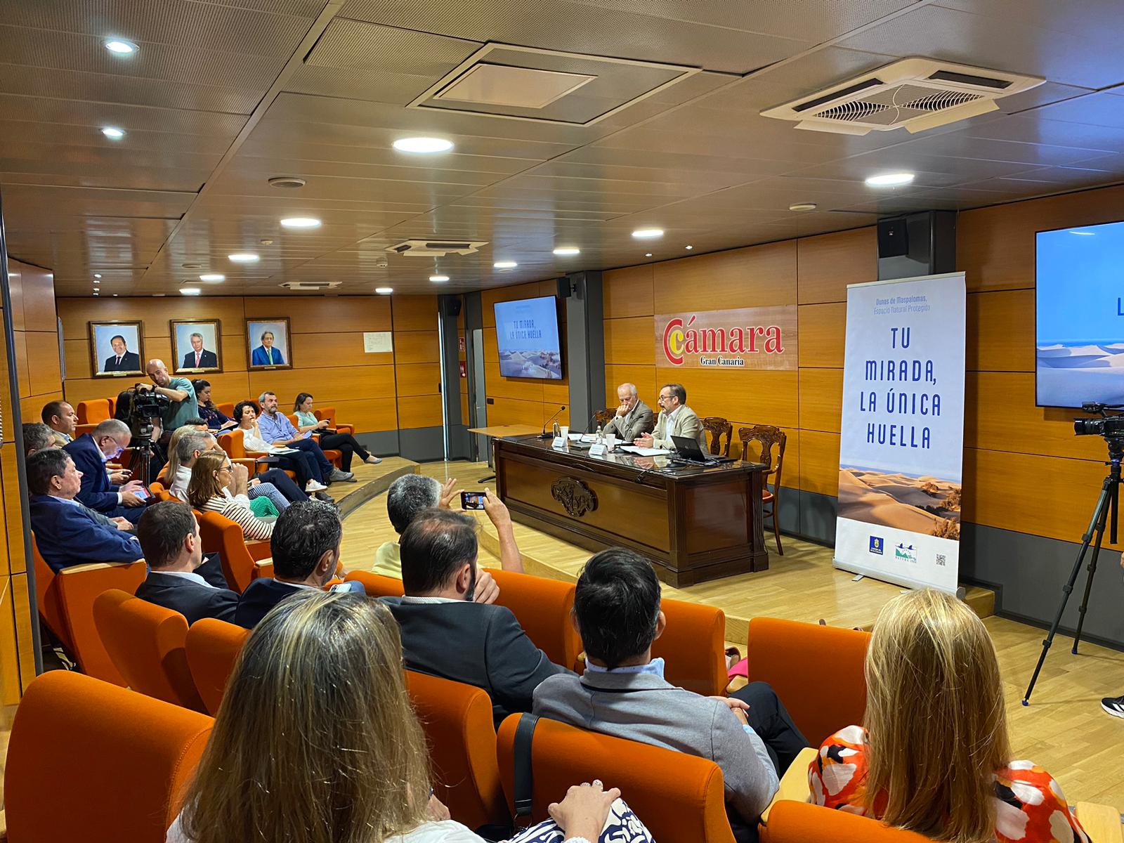 El consejero de Medio Ambiente, Clima, Energía y Conocimiento del Cabildo de Gran Canaria, Raúl García Brink, junto al vicepresidente de la Cámara de Comercio de Gran Canaria, Santiago de Armas, presentó la campaña de concienciación ‘Tu mirada, la única huella’ en una mesa redonda abierta con el objetivo de aunar esfuerzos con diferentes sectores de la sociedad en el cuidado del Espacio Natural Protegido de las Dunas de Maspalomas.