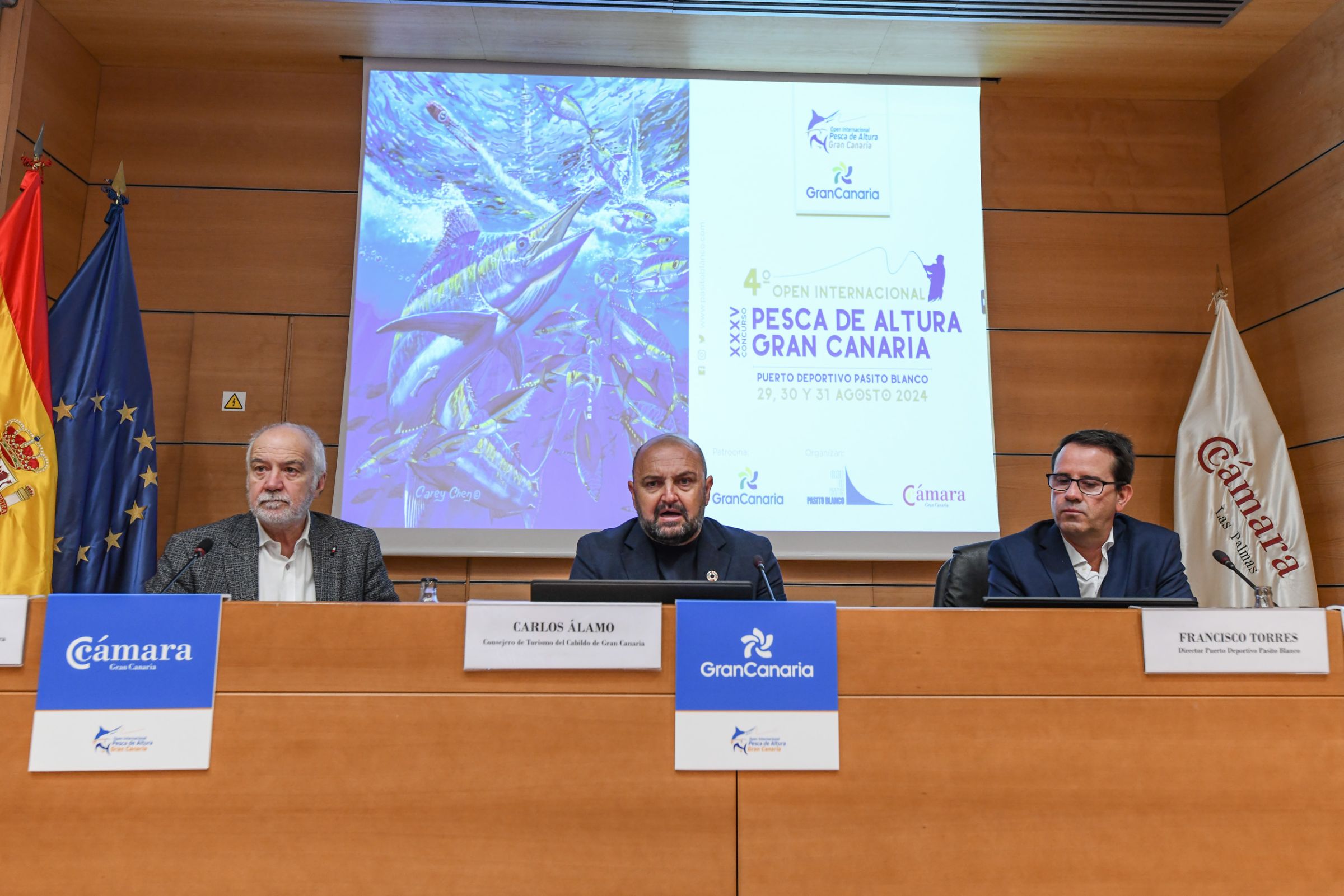 El consejero de Turismo del Cabildo de Gran Canaria, Carlos Álamo, informó de las novedades de la cita estival este miércoles en la sede de la Cámara de Comercio en Las Palmas de Gran Canaria, junto al vicepresidente y presidente de la Comisión de Turismo de la misma, Santiago de Armas; y el director del Puerto Deportivo Pasito Blanco, Francisco Torres. El acto permitió descubrir el cartel anunciador de la próxima edición, que ha sido diseñado, por segundo año consecutivo, por el periodista e ‘influencer’ estadounidense, referente en el mundo de la Pesca de Altura, Carey Chen , destacando el valor turístico que presenta la prueba deportiva.