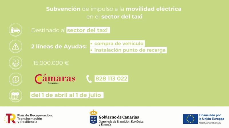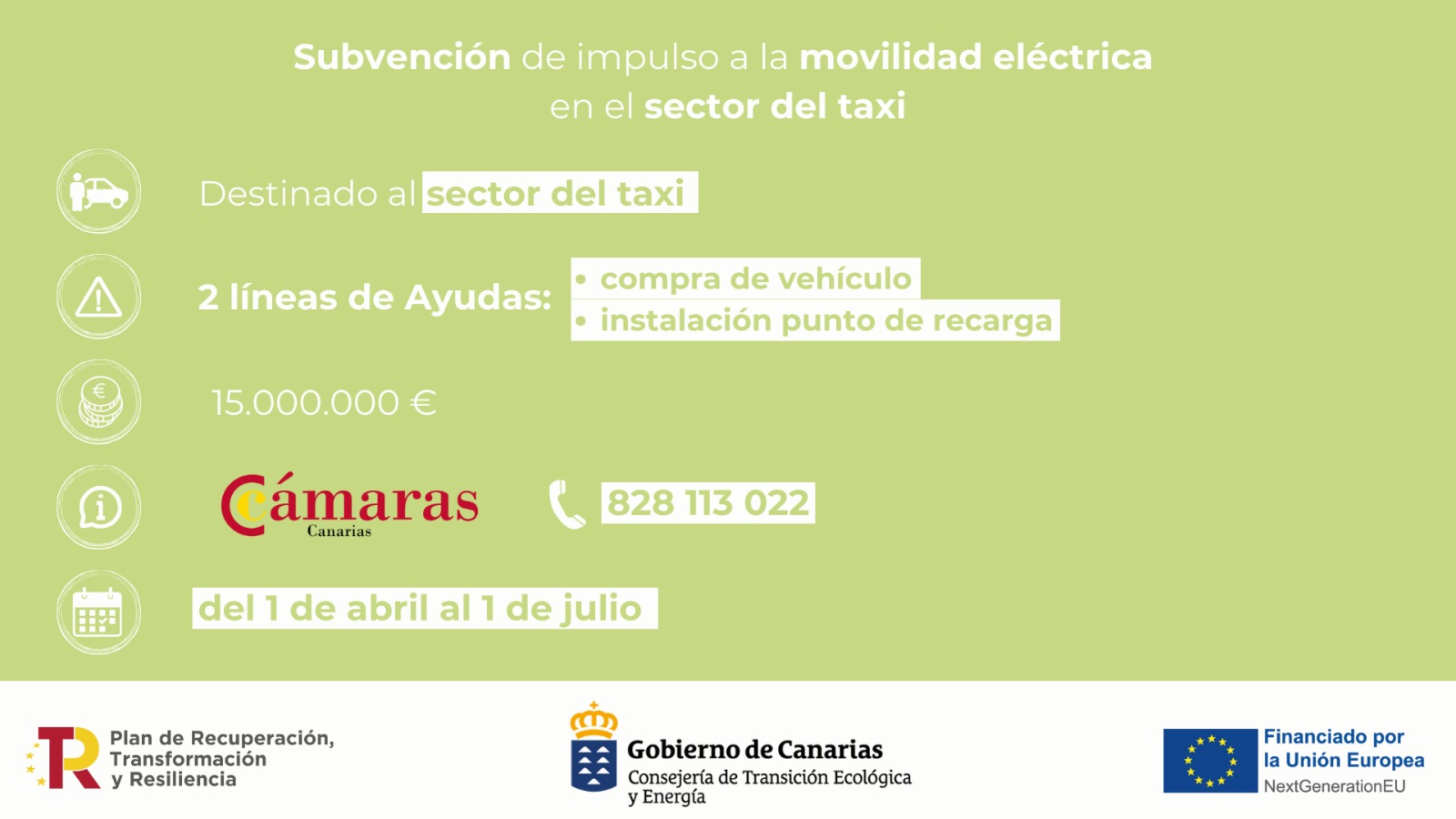 Las Cámaras de Comercio de Canarias han sido designadas por la consejería de Transición Ecológica y Energía del Gobierno de Canarias para la tramitación de las subvenciones en régimen de concurrencia no competitiva para el despliegue del vehículo eléctrico e infraestructuras de recarga en el sector del taxi en el marco de la Estrategia de Energía Sostenible en las Islas Canarias, con cargo al instrumento de financiación europeo fondos «Next Generation EU», en el marco del Plan de Recuperación, Transformación y Resiliencia.